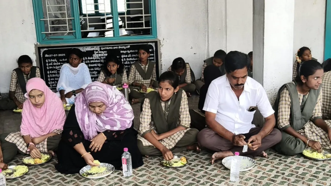 బాలికల ఉన్నత పాఠశాలను ఆకస్మికంగా తనిఖీ చేసి విద్యార్థులతో కలసి భోజనం చేసిన టిడిపి నాయకులు.