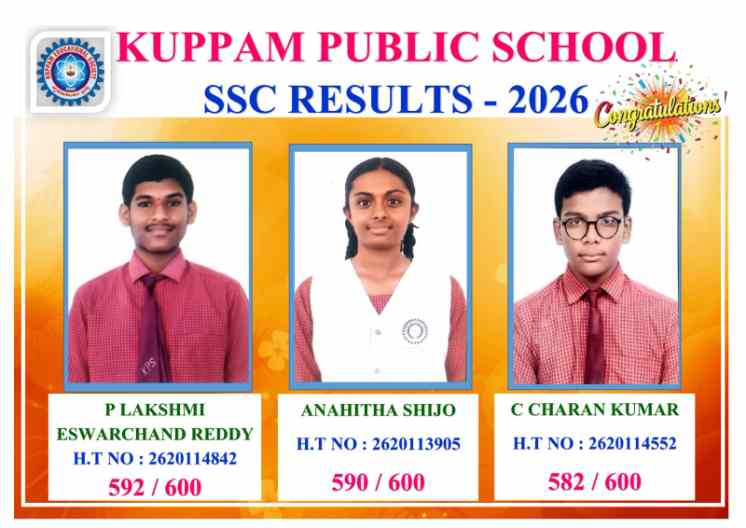 10 వ తరగతి 2026 ఫలితాలలో కుప్పం పబ్లిక్ స్కూల్ విద్యార్థులు రాష్ట్రస్థాయి మార్కులతో ప్రభంజనం సృష్టించారు. పెద్దమల్లు లక్ష్మి ఈశ్వర్ చంద్ రెడ్డి ( H.T NO. 2620114842) 592/600 మార్కులతో ప్రథమ స్థానం, అనహిత షిజో ( H.T NO. 2620113905) 590/600 మార్కులతో ద్వితీయ స్థానం, సి.చరణ్ కుమార్ ( H.T NO. 2620114552) 582/600 మార్కులతో తృతీయ స్థానం సాధించారు. 31 మంది విద్యార్థులు 500 లకు పైన మార్కులు సాధించారు. వీరిలో 19 మంది 550 పైన మార్కులు సాధించారు. మిగిలిన వారు ప్రథమ శ్రేణిలో ఉత్తీర్ణులయ్యారు. సబ్జెక్ట్ పరంగా తెలుగు 100/100 ఇద్దరు, హింది 100/100 నలుగురు, గణితం 100/100 ఇద్దరు, సైన్స్ 100/100 ఒకరు, సోషియల్ 100/100 ఒకరు సాధించారు.