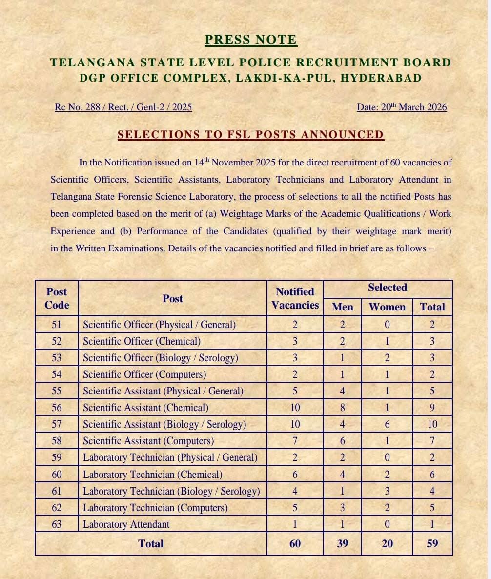 తెలంగాణ స్టేట్ ఫోరెన్సిక్ సైన్స్ లాబొరేటరీ (FSL) ఫలితాలు విడుదల: ఎంపికైన అభ్యర్థులకు కీలక సూచనలుఎంపికైన అభ్యర్థులకు కీలక సూచనలు